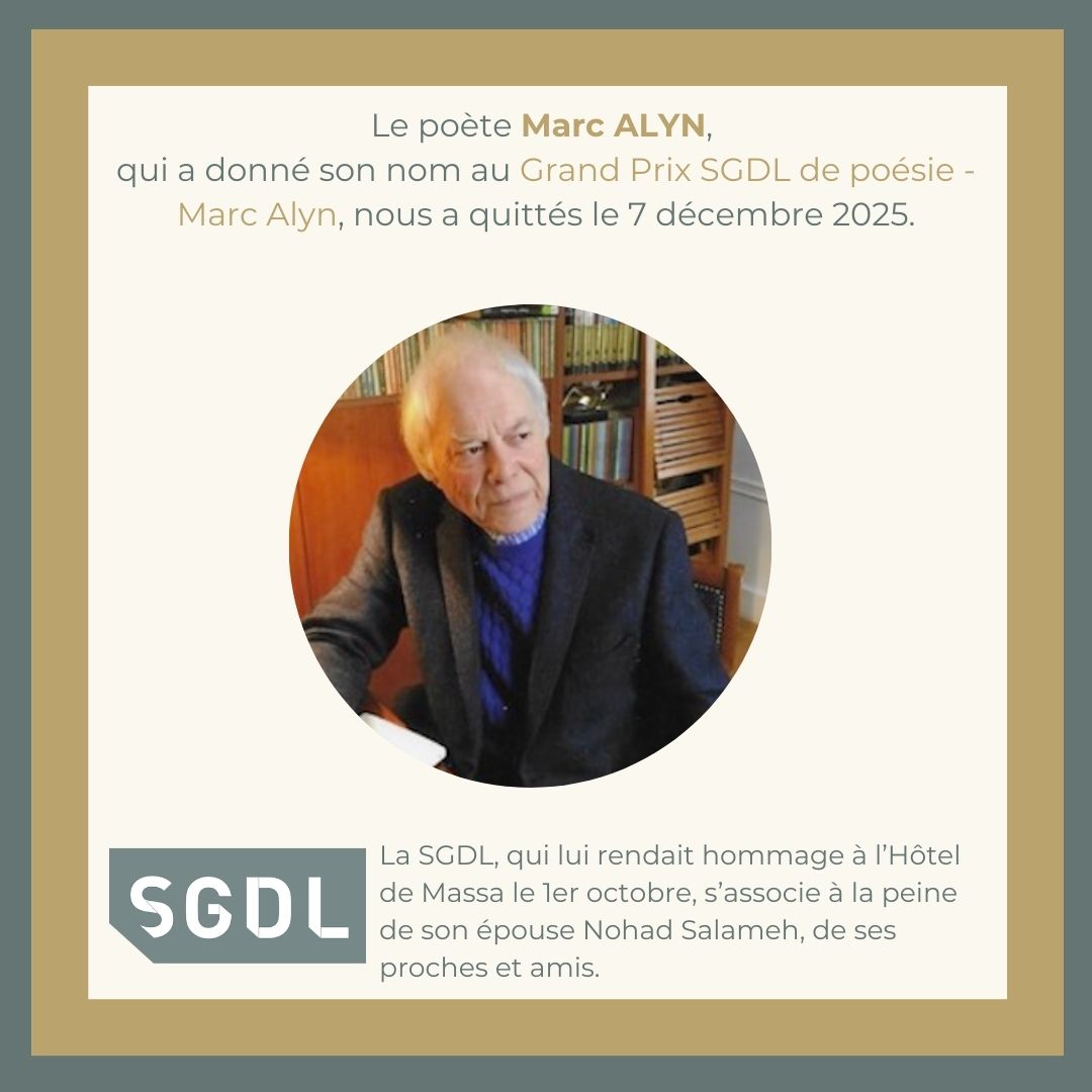 Le poète 𝐌𝐚𝐫𝐜 𝐀𝐥𝐲𝐧, à qui la SGDL rendait hommage à l'Hôtel de Massa début octobre, nous a quittés le 7 décembre 2025. La Société des Gens de Lettres s'associe à la peine de son épouse Nohad Salameh, de ses proches et amis, en présence desquels nous célébrions l'œuvre de Marc Alyn il y a seulement quelques mois.