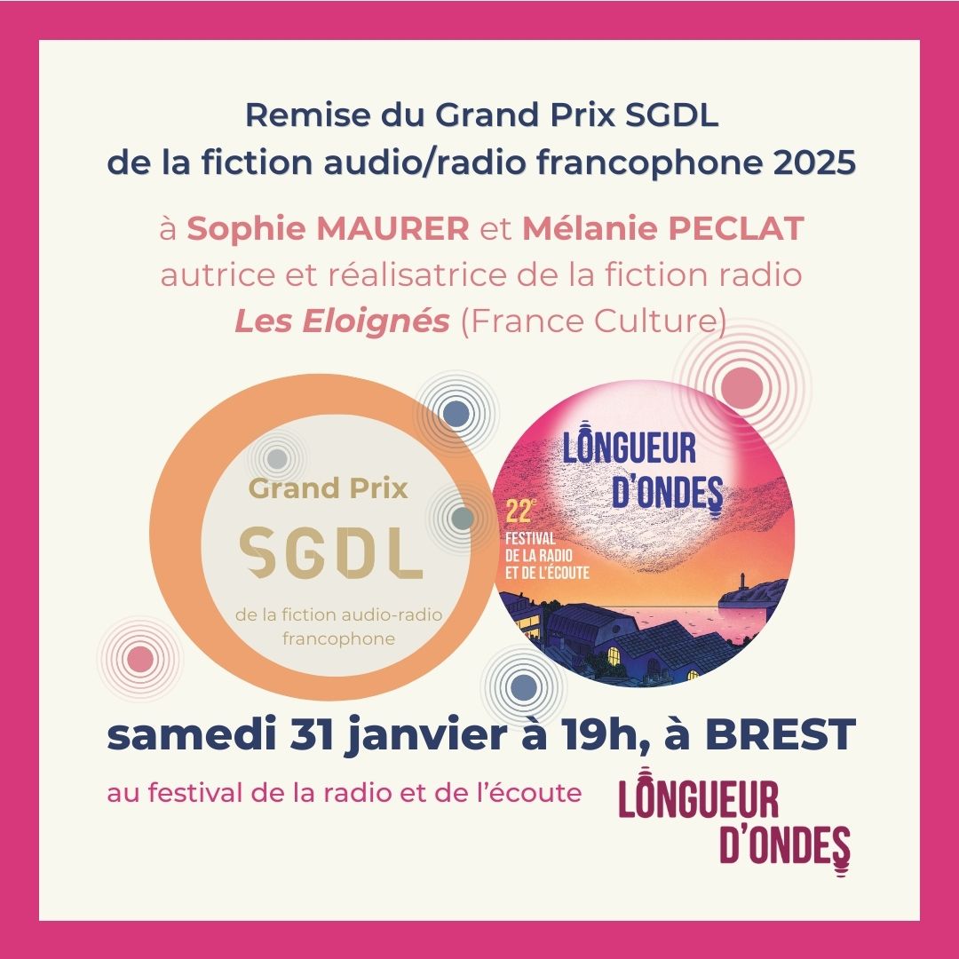 En 2025, le Grand Prix SGDL de la fiction audio-radio francophone a récompensé la fiction radiophonique de Sophie Maurer, Les Éloignés (France Culture). Il sera remis le 31 janvier à Brest au Festival "Longueur d'ondes ", notre partenaire, et une table ronde est organisée la veille, le 30 janvier, avec l'autrice, Sophie Maurer, et la réalisatrice, Mélanie Péclat, modérée par deux auteurs membres du Comité de la SGDL et du jury : Isabelle Sivan et Christophe Deleu.