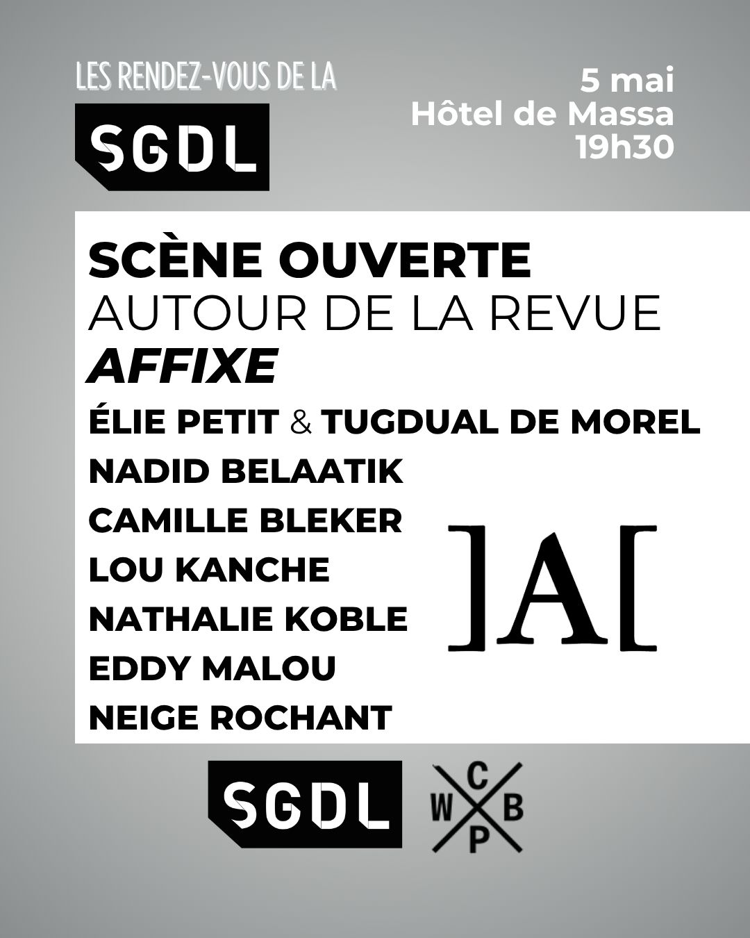 La SGDL vous donne régulièrement rendez-vous autour d'une revue, à la rencontre des auteurs qui y collaborent. Le mardi 5 mai à 19h30 à l'Hôtel de Massa, nous vous convions, en partenariat avec le Centre Wallonie Bruxelles, à une soirée littéraire de lectures performées, avec sept autrices et auteurs qui ont collaboré aux numéros d'Affixe, suivie d'un pot convivial autour de la table de la librairie Vocabulaire.